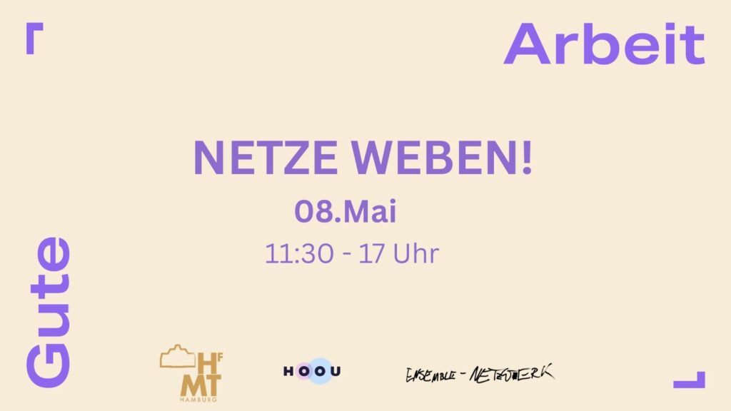 Unter dem Stichwort GUTE ARBEIT laden wir, der Dramaturgiejahrgang 2025, in Kooperation mit dem ensemble-netzwerk und der HOOU euch ein, mit uns aktiv zu werden! Gemeinsam wollen wir herausfinden: Wie sehen gute Arbeitsverhältnisse in der Kunst aus? Welche Veränderungen sind notwendig? Welche neuen Allianzen braucht es für die Zukunft? Und vor allem, wie im Theater zu arbeiten Spaß machen kann! Gerade für uns als Berufseinsteiger:innen ist es wichtig, Anlaufstellen und Handlungsmöglichkeiten zu kennen. Wir teilen Erfahrungen, benennen, was nicht funktioniert, und fragen: Was brauchen wir eigentlich für gute Arbeit und was bedeutet Solidarität für dich? Vertreter*innen des ensemble-netzwerks sind zu Gast und bieten Einblicke in ihr Wissen und ihre Erfahrungen zum Thema Arbeitsbedingungen.